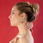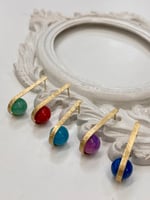 Los pendientes cherri están hechos a mano en latón y cristal teñido con un acabado lijado.